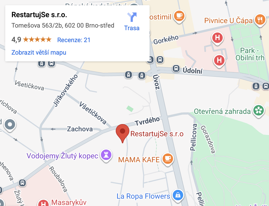 V současné době probíhají setkání v centru RestartujSe! na adrese Tomešova 563/2B, Brno převážně v dopoledních hodinách. U centra je k dispozici jedno parkovací místo pro zákazníky, které případně můžete využít (prosím parkujte mimo vyznačené zelené plochy). Pokud je obsazené, je parkování možné v modrých zónách ulice. Objednání je možné po domluvě na uvedeném telefonním čísle, pokud se nedovoláte pište prosím sms, ozvu se hned jakmile to bude možné. Prosím snažte se chodit v přesně domluvený čas. Děkuji za pochopení.